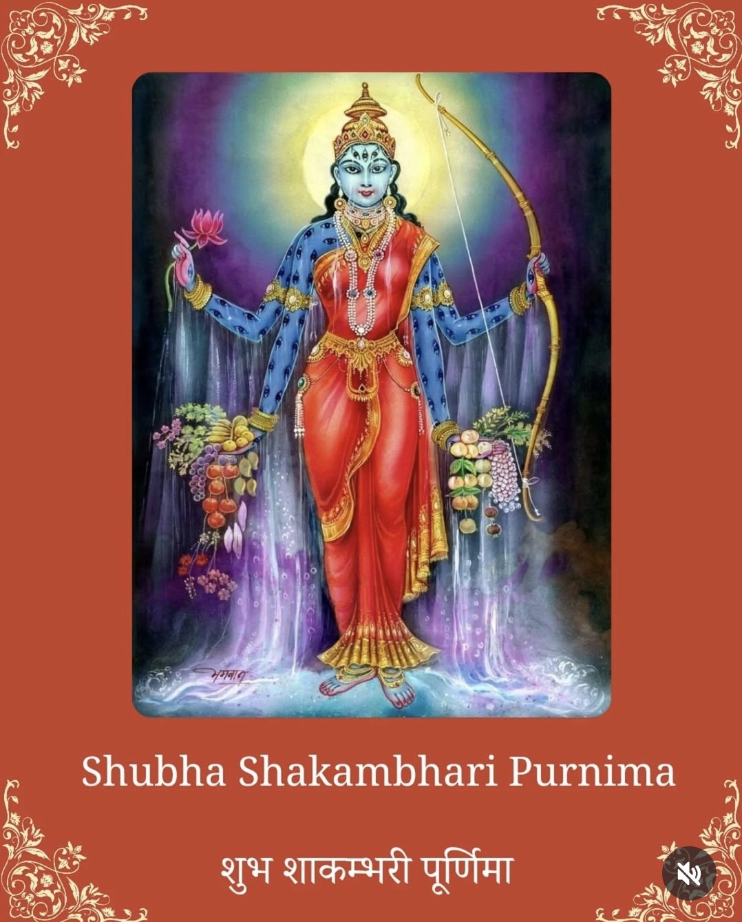 Shakambhari, also referred to as Shatakshi, is a goddess of nourishment. After the malevolent asura Durgamasura deprived the earth of nourishment by causing the sages to forget the Vedas, the goddess appeared to offer human beings and devas sufficient fruits and vegetables to restore their strength